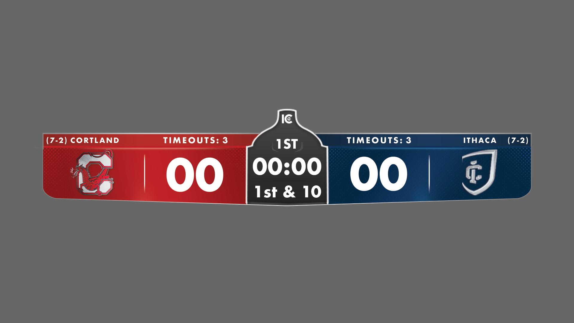 Scorebug created for the Cortland vs. Ithaca “Cortaca” broadcast, featuring the Cortaca Jug at the center of the bug. The structure of the bug is shaped around the Bombers Live broadcast logo to maintain consistent visual identity.